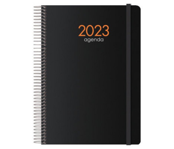 Agenda anual. Cubierta realizada en tapa de polipropileno opaco, goma elástica y puntas redondeadas. Interior con semana a la vista, impresa a dos colores en papel offset blanco de 70 grs., con 160 páginas. Datos personales, Calendario trienal, Planning del año, Indicativos internacionales, Páginas para anotaciones. Cabeceras en 5 idiomas (Castellano, Catalán, Gallego, Euskera y Portugués), Onomástica, Semana, Calendarios del mes actual y siguiente.