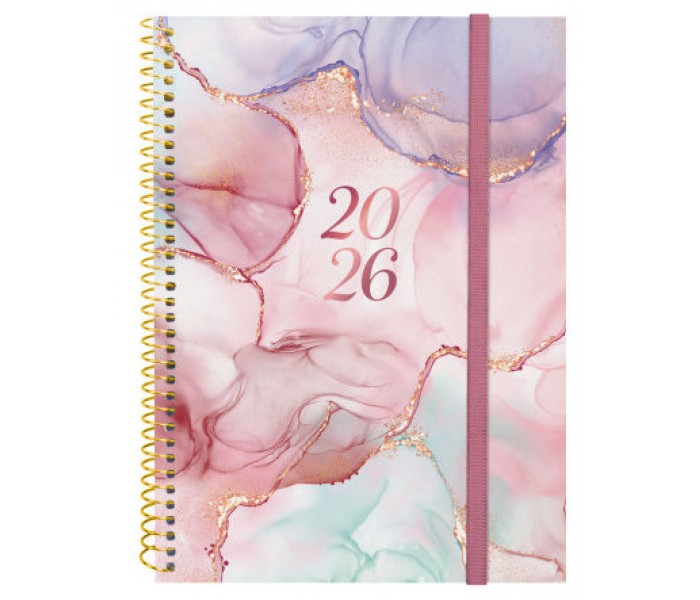 Agenda de espiral con tapas ligeras de polipropileno. Diseño en tendencia y a la moda. Ideal para uso personal y/o profesional. Con goma elástica. Con esquinas microperforadas para localizar rápidamente el día/semana en curso. El diseño interior es limpio y fácil, con espacio suficiente para organizar tus proyectos, tareas y compromisos. Agenda con información de interés en la anualidad y otros contenidos extra orientados a la organización personal. Formato similar a DIN A5 con las ventajas de una agenda portable y una de sobremesa. Duración: Enero 2026 - Diciembre 2026 (12 meses). Interior: Semana Vista Horizontal. Visión de la semana completa en horizontal que permite la escritura natural. Con espacio para concretar horario. Con información de los festivos de España. La anualidad de la agenda incluye la información relativa a: onomástica, festivos nacionales, cambios de estación e inicios de los años nuevos chino, musulmán, ortodoxo y hebreo. La agenda dispone también de otros contenidos extra: datos personales, calendarios, horarios, objetivos del año, plan anual, fechas importantes, otras fechas, hojas para checklist, hojas para notas, hoja para ocio y hojas para teléfonos, direcciones y e-mails. Artículo en español con anualidad multilingüe: español, euskera, gallego y catalán. Formato: E10 - 155x212 mm. Tapas de polipropileno, espiral simple metálica y papel. 80 g/m². Papel FSC®.