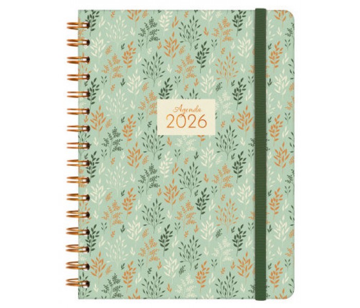 Agenda de espiral con tapa dura de cartón forrado con peliculado mate antirrayaduras. Diseño elegante y en tendencia con detalles estampados metalizados. Ideal para uso personal y/o profesional. Con goma elástica y esquinas microperforadas para localizar rápidamente el día/semana en curso. El diseño interior es limpio y fácil, con espacio suficiente para organizar tus proyectos, tareas y compromisos. Contiene información de interés en la anualidad y otros extra para la organización personal. Además, incorpora un set de adhesivos temáticos. Formato similar a DIN A5 con las ventajas de una agenda portable y una de sobremesa. Duración: Enero 2026 - Diciembre 2026 (12 meses). Interior: Semana Vista Horizontal. Visión de la semana completa en horizontal que permite la escritura natural. Con espacio para concretar horario. Con información de los festivos de España. La anualidad de la agenda incluye la información relativa a: onomástica, festivos nacionales, cambios de estación e inicios de los años nuevos chino, musulmán, ortodoxo y hebreo. La agenda dispone también de otros contenidos extra: datos personales, calendarios, horarios, objetivos del año, plan anual, fechas importantes, otras fechas, hojas para checklist, hojas para notas, hoja para ocio, hojas para teléfonos, direcciones y e-mails y dos hojas de pegatinas orientadas a la organización personal. Artículo en español con anualidad multilingüe: español, euskera, gallego y catalán. Formato: E10 - 155x212 mm. Tapas de cartón forrado con peliculado mate antirrayaduras. Espiral doble metálica. Papel. 80 g/m². Papel FSC®.