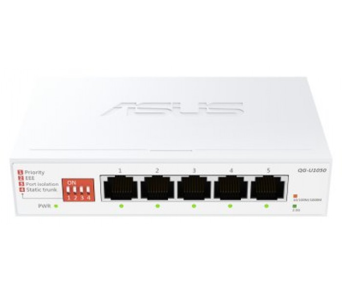 ASUS QG-U1050. Tipo de interruptor: No administrado. Puertos tipo básico de conmutación RJ-45 Ethernet: 2.5G Ethernet (100/1000/2500), Cantidad de puertos básicos de conmutación RJ-45 Ethernet: 5. Tabla de direcciones MAC: 16000 entradas. Estándares de red: IEEE 802.3ab, IEEE 802.3az, IEEE 802.3bz, IEEE 802.3u, IEEE 802.3x. Voltaje de entrada DC: 12 V