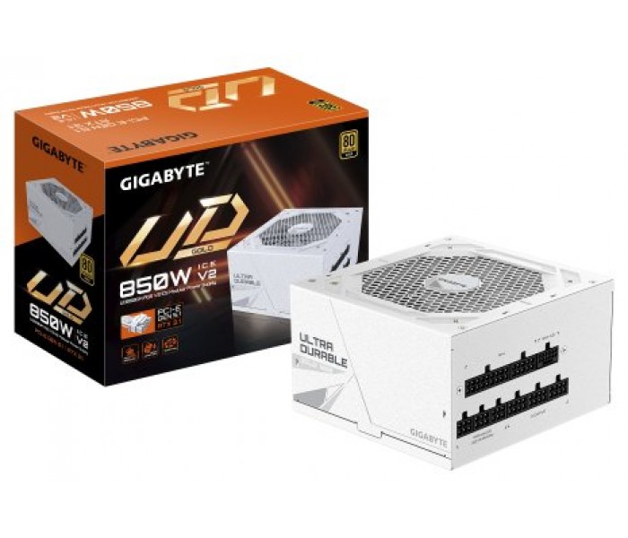 GIGABYTE UD850GM PG5 V2 ICE. Potencia total: 850 W, Voltaje de entrada AC: 100 - 240 V, Frecuencia de entrada AC: 50/60 Hz. Alimentador de energía para tarjeta madre: 20+4 pin ATX, Longitud del cable de alimentación de la placa base: 61 cm, Longitud del cable de conectores de alimentación PCI Express (12+4 pines): 700 mm. Utilizar con: PC, Factor de forma de fuente de alimentación (PSU): ATX, Certificación 80 PLUS: 80 PLUS Gold. Color del producto: Blanco, Tipo de enfriamiento: Activo, Diámetro de ventilador: 12 cm. Ancho: 150 mm, Profundidad: 140 mm, Altura: 86 mm