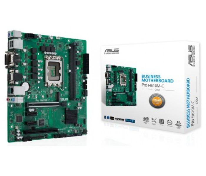 ASUS Pro H610M-C-CSM. Fabricante de procesador: Intel, Socket de procesador: LGA 1700, Procesador compatible: Intel® Celeron®, Intel® Core™ i3, Intel® Core™ i5, Intel® Core™ i7, Intel® Core™ i9, Intel® Pentium®. tipos de memoria compatibles: DDR5-SDRAM, Memoria interna máxima: 64 GB, Tipo de ranuras de memoria: DIMM. Interfaces de disco de almacenamiento soportados: M.2, SATA III, Tipos de unidades de almacenamiento admitidas: HDD & SSD. Tipo de interfaz ethernet: Gigabit Ethernet. Componente para: PC, Factor de forma: micro ATX, Familia del chipset: Intel