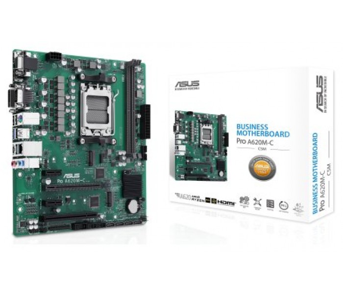 ASUS PRO A620M-C-CSM. Fabricante de procesador: AMD, Socket de procesador: Zócalo AM5, Procesador compatible: AMD Ryzen 7000 Series. tipos de memoria compatibles: DDR5-SDRAM, Memoria interna máxima: 96 GB, Tipo de ranuras de memoria: DIMM. Interfaces de disco de almacenamiento soportados: M.2, SATA III, Tipos de unidades de almacenamiento admitidas: HDD & SSD, Niveles RAID: 0, 1, 10. Tipo de interfaz ethernet: Gigabit Ethernet. Componente para: PC, Factor de forma: micro ATX, Familia del chipset: AMD