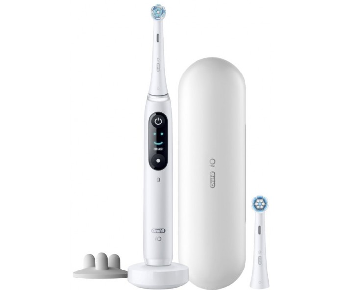 Oral-B iO 8S. Utilizar con: Adulto, Tipo de cepillo de dientes: Cepillo dental vibratorio, Modos del cepillo de dientes: Cuidados diarios, Limpieza profunda, Super sensitive, Cuidado de las encías, Sensible, Blanqueador. Fuente de energía: Batería, Tipo de batería: Batería integrada, Tiempo de recarga de la batería: 3 h. Tipo de embalaje: Caja. Número de empuñaduras incluidas: 1 pieza(s), Número de cabezales incluido: 2 pieza(s)