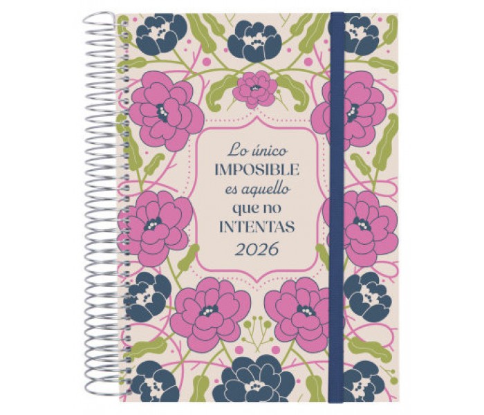 Agenda de espiral con tapas ligeras de polipropileno. Diseño en tendencia y a la moda. Ideal para uso personal y/o profesional. Con goma elástica. Con esquinas microperforadas para localizar rápidamente el día/semana en curso. El diseño interior es limpio y fácil, con espacio suficiente para organizar tus proyectos, tareas y compromisos. Agenda con información de interés en la anualidad y otros contenidos extra orientados a la organización personal. Formato similar a DIN A5 con las ventajas de una agenda portable y una de sobremesa. Duración: Enero 2026 - Diciembre 2026 (12 meses). Interior: 1 Día Página. Amplio espacio de escritura para cada día. Con horas. Sábados y domingos en página completa. Con información de los festivos de España. La anualidad de la agenda incluye la información relativa a: onomástica, festivos nacionales, cambios de estación e inicios de los años nuevos chino, musulmán, ortodoxo y hebreo. La agenda dispone también de otros contenidos extra: datos personales, calendarios, horarios, objetivos del año, plan anual, fechas importantes, otras fechas, hojas para checklist, hojas para notas, hoja para ocio y hojas para teléfonos, direcciones y e-mails. Artículo en español con anualidad multilingüe: español, euskera, gallego y catalán. Formato: E10 - 155x212 mm. Tapas de polipropileno, espiral simple metálica y papel. 70 g/m². Papel FSC®.