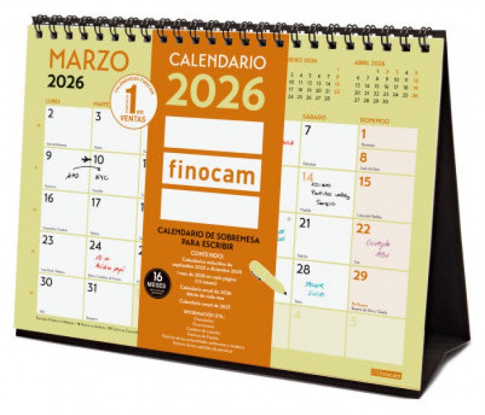 Calendario anual de sobremesa a todo color encuadernado con espiral doble. Con un toque moderno para aportar un ambiente casual a tu organización. Contiene información útil y de interés, espacio diario para anotaciones y con mes anterior y posterior en cada página. Perfecto para planificar tus días. Ideal para la oficina o el hogar. Duración: Enero 2026 - Diciembre 2026 (12 meses) + Sep.-Dic. 2025 (4 meses) reducidos. Interior: Mes Vista. Para planificarse a nivel mensual. Con información de los festivos de España. La anualidad del calendario incluye la información relativa a: onomástica, festivos nacionales, festivos de las CC. AA., días señalados, fases lunares y cambios de estación. Detrás de la hoja de cada mes se puede consultar el calendario anual. El calendario dispone también de otros contenidos extra: calendarios reducidos de septiembre a diciembre del año anterior, calendario anual del año y del año siguiente, planning anual, listado de festivos de las CC. AA. y de las capitales de provincia e inicios de los años nuevos chino, musulmán, ortodoxo y hebreo. Idioma del artículo: español. Formato: S - 210x150 mm. Papel y espiral doble metálica. 120 g/m². Papel FSC®.