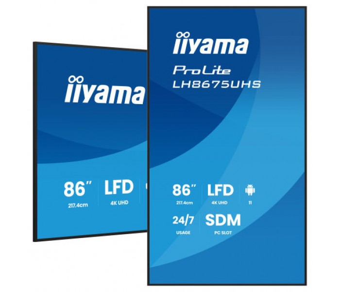 iiyama LH8675UHS-B2AG. Diseño de producto: Pantalla plana para señalización digital. Diagonal de la pantalla: 2,17 m (85.6"), Tecnología de visualización: LCD, Resolución de la pantalla: 3840 x 2160 Pixeles, Brillo de pantalla: 500 cd / m², Tipo HD: 4K Ultra HD. Wifi. Horas de funcionamiento (horas/días): 24/7. Sistema operativo instalado: Android 11. Color del producto: Negro