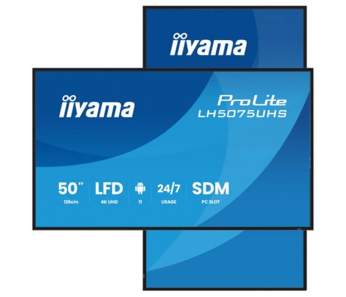 iiyama LH5075UHS-B2AG. Diseño de producto: Pantalla plana para señalización digital. Diagonal de la pantalla: 125,7 cm (49.5"), Tecnología de visualización: LCD, Resolución de la pantalla: 3840 x 2160 Pixeles, Brillo de pantalla: 500 cd / m², Tipo HD: 4K Ultra HD. Wifi. Horas de funcionamiento (horas/días): 24/7. Sistema operativo instalado: Android 11. Color del producto: Negro