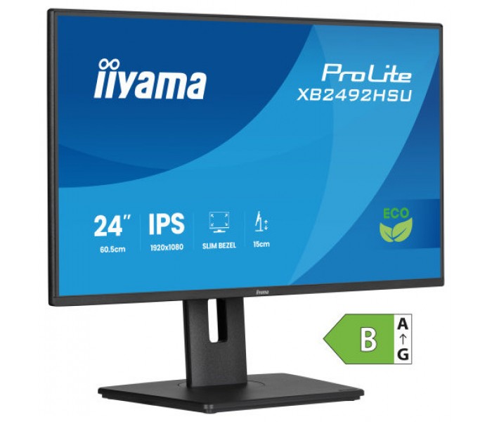 iiyama ProLite XB2492HSU-B1. Diagonal de la pantalla: 61 cm (24"), Resolución de la pantalla: 1080 x 1920 Pixeles, Tipo HD: Quad HD, Tecnología de visualización: LED, Superficie de la pantalla: Mate, Tiempo de respuesta: 3 ms, Relación de aspecto nativa: 16:9, Ángulo de visión, horizontal: 178°, Ángulo de visión, vertical: 178°. Altavoces incorporados. Conector USB incorporado, Versión de conector USB: 3.2 Gen 1 (3.1 Gen 1). montaje VESA, Ajustes de altura. Color del producto: Negro