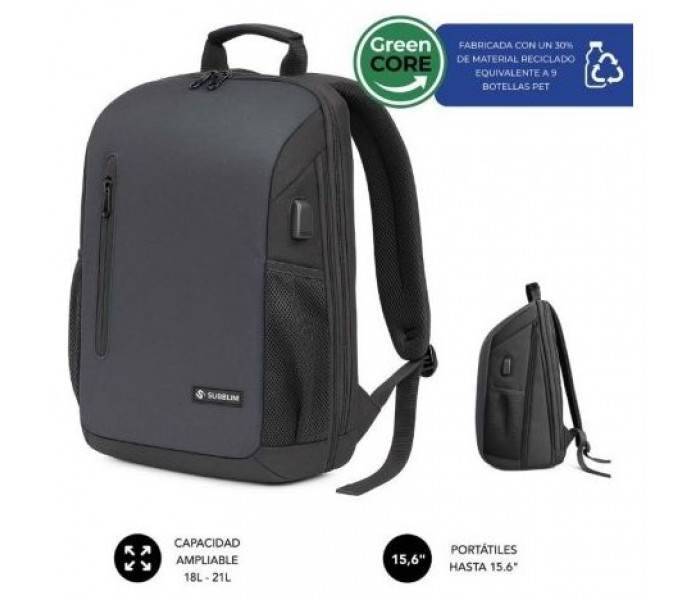 Bolsillo frontal de acceso rápido Panel interior para cargadores, bolígrafos y ratón Bolsillos laterales elásticos para botellas Puerto USB-C externo para cargar tu móvil en movimiento (requiere power bank)