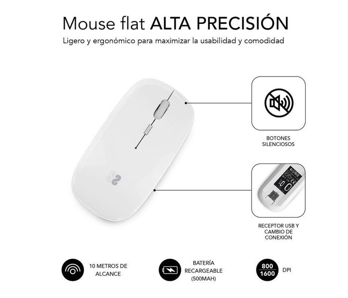 - Silent Click. El Dual Flat Mouse es silencioso para poder llevarlo a cualquier sitio, desde tu trabajo, un centro de estudio, tu casa. La tecnología Silent